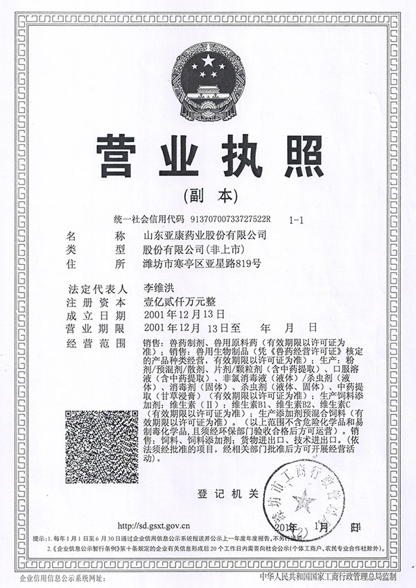 山東亞康藥業股份有限公司創建于1996年,公司位于濰坊市寒亭區通亭街657號(濟青高速公路與206國道交匯處),注冊資金1.2億元人民幣,占地70畝,地理位置優越,交通便利。公司下設獸藥原料部、飼料原料部、獸藥制劑部、生物制品經營部、GMP獸藥廠、市區經營部、國際業務部、電子交易部八大經營部門。